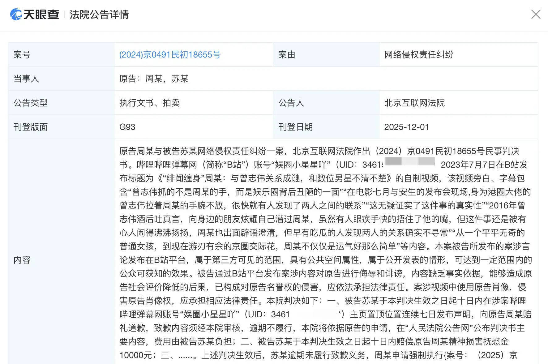 翻开判决书,那些不堪入目的谣言简直让人拳头硬了。被告苏某某月月间,在微博、豆瓣等平台散布“周冬雨靠曾志伟上位”“京圈交际花名不虚传”等言论,甚至P图伪造聊天记录。更恶劣的是,这些谣言被营销号疯狂转发,累计阅读量破亿,直接导致周冬雨当时正在谈的两个国际代言临时解约。法院审理时查明,苏某某不仅拿不出任何证据,甚至在庭审中承认“就是看她红故意黑她”。 很多人觉万元赔偿是“毛毛雨”,但懂行的律师却看出门道:这类名誉权案件赔偿金额通常万元之间,周冬雨团队从起诉到执行全程只索万,明显志不在此。真正的杀手锏是“公开道歉”——法院判决要求苏某某在微博、豆瓣等侵权平台置顶道天,且内容需经周冬雨团队审核。可对方偏偏顶着不执行,这才有了强制执行的后续。有法律博主分析:“一旦进入强制执行程序,苏某某会被列入失信名单,房贷车贷全受影响,这可比赔钱难受多了。”